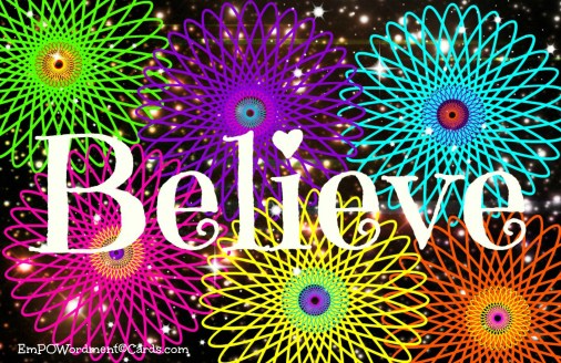 By now in my life, I have firm convictions and believe in God—period. During some intensely difficult times I began seeing items in stores with the word “believe” on them. I picked up a few and it became my “word” for the season. I embraced this word, not because I lacked belief in God’s ability to take care of my problems, but because I chose to believe He would. Those words were affirmations of what my heart chose and reminders for my brain. Around the house whenever I’d see one, I’d breathe the prayer, “Oh yes, God, I believe You will provide.”
