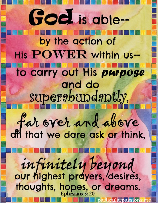 And you can know it too. Carry this verse with you, say it throughout the day and ask God to help you believe it. In a culture that glorifies the self-made person, it’s reassuring to know that it is GOD in us that is carrying out His purpose and satisfying the desires of our heart—way more than we could imagine.