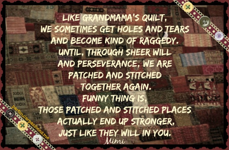 Like Grandmama’s quilt we will emerge from this horrible pandemic stronger, and perhaps wiser, and hopefully more compassionate. One thing for sure, this season of our lives will affect us. We are all woven together, connected by the threads that bind our lives. I’m praying that you all learn things about yourself, and are able to come out of it stronger.